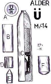 Luoti Ü/ 1910. Sisäinen rakenne on kuin luodissa Ü/ 1914. C = Kaaviokuva sytyttimen