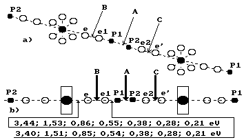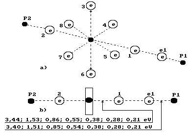 The analysis of binding energies between the electrons and the protons of the hydrogen atoms in the cluster, which consists of two water molecules (Fig. 101), shows the possibility of realization of various variants of disruption of these bonds. Under the usual conditions the bond  is broken between the protons  and , which belong to the hydrogen atoms in the water molecule. Simultaneous break of the bonds  and  is possible. In the last case, the hydrogen molecule is released. Realization of this or that variant of the bond break depends on the temperature of the environment, in which the water molecules are situated.