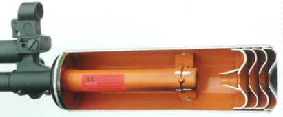 The TX4 Ranger of M62 opened reveals the internal simplicity of the Reflex Suppressor that is especially designed for standard full power ammo. The muzzle blast gets offset from the bullet path by the diffractor cone. After that the first baffle reflects it backwards into the large expansion chamber telescopically around the barrel. This principle enables an exceptionally short and light all steel construction: the TX4 Ranger weighs less than 300 grams (2/3 lbs.) and extends over the muzzle 5 centimeters (2 in.).  Becouse the Reflex Suppressors have initially been designed for Valmet M62 to be used with regular supersonic cartridges, the first expansion chamber is exceptionally large for only minor gas port pressure delay increase. The T8 Scout and T4 Ranger models for the more powerful .308 Win and other rifle calibers have even larger first expansion chamber.