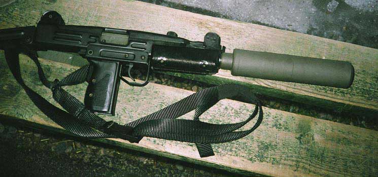 "Itseladattava kertatulikonepistooli" eli UZI 9X19 mm BR-Tuotteen vaimentimella.